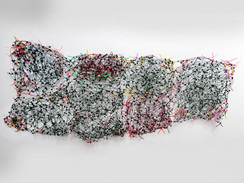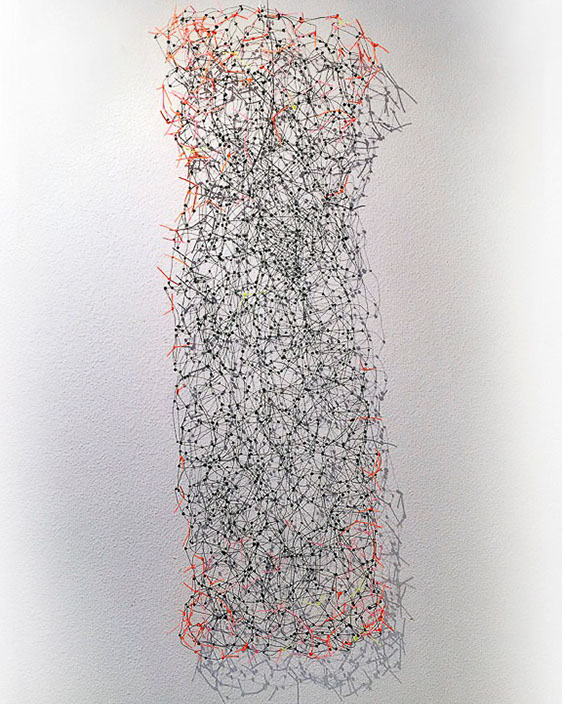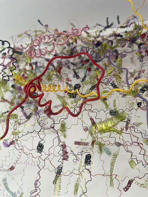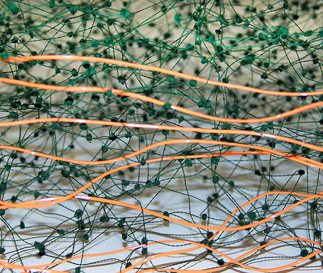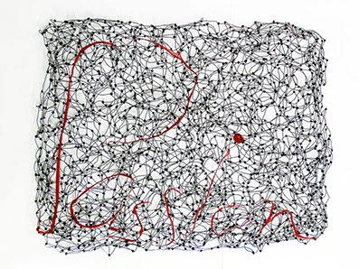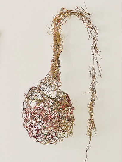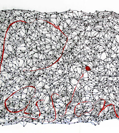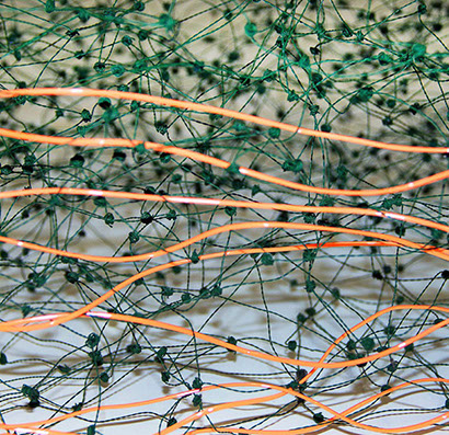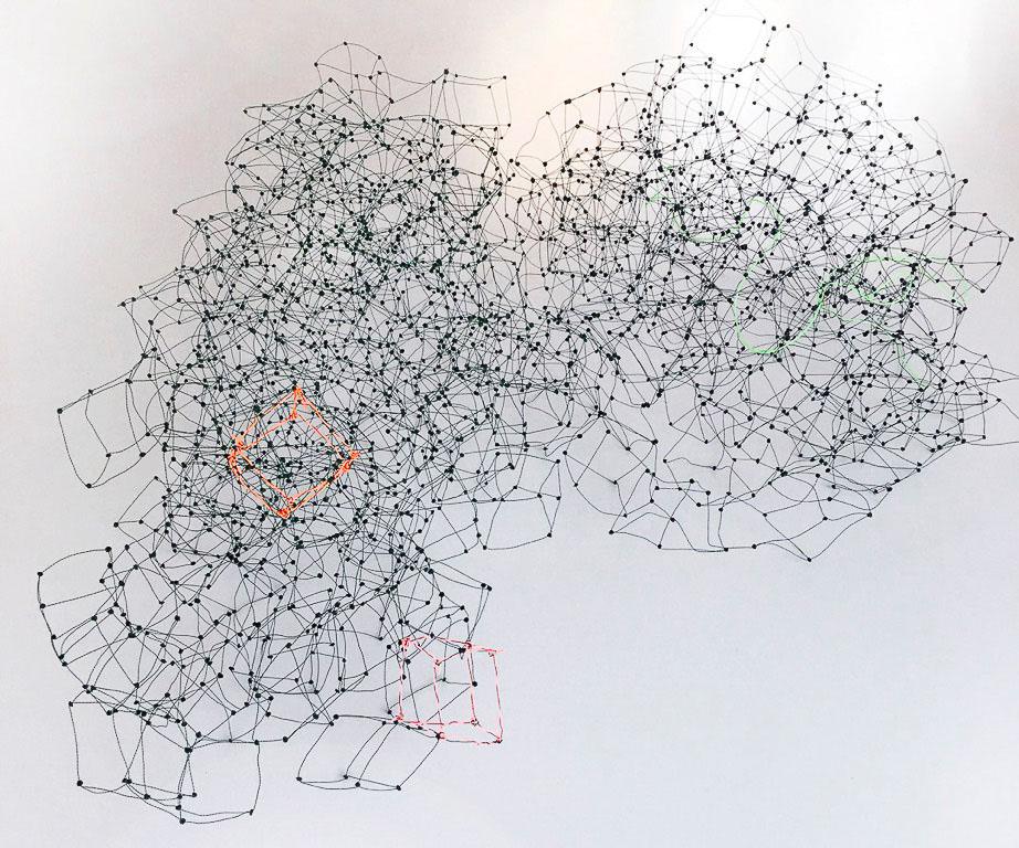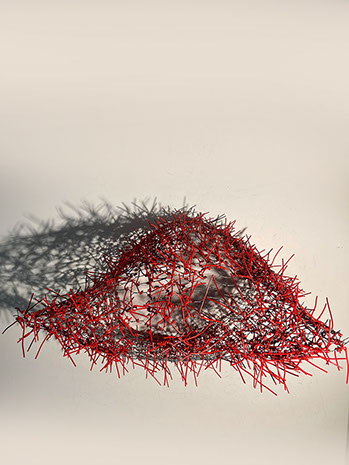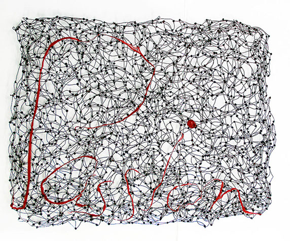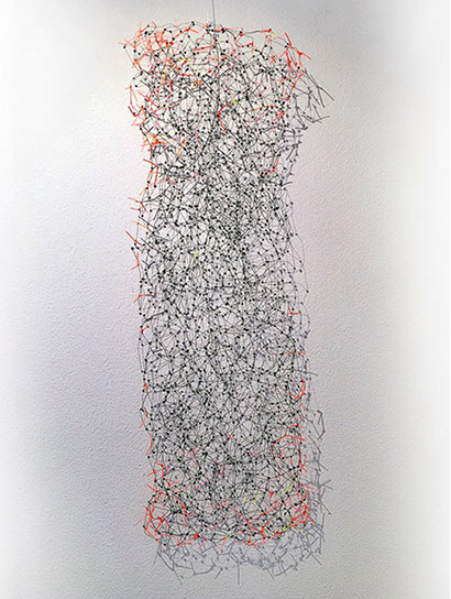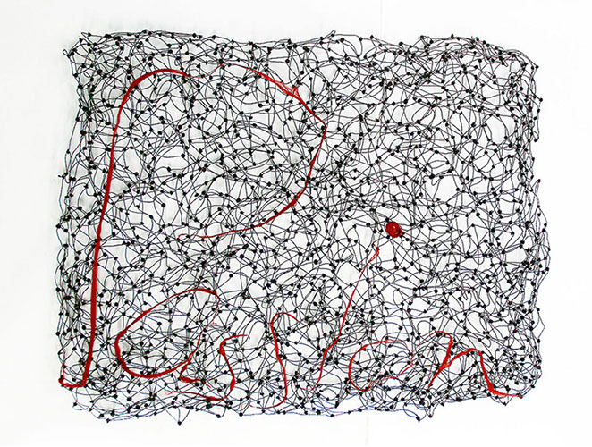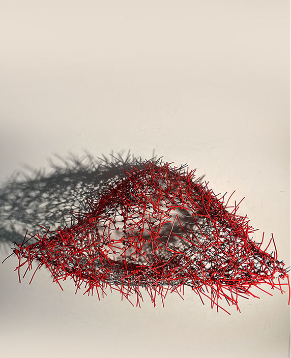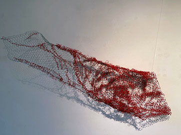Beim ersten Blick auf die Drahtgeflechte von Rosmarie von Scarpatetti würden wir kaum erwarten, dass diese dichten, organisch anmutenden Netzstrukturen aus lauter einzelnen Drahtwürfeln bestehen. Wer dem Rhythmus der sich wiederholenden Linien und Punkte folgt, begibt sich in Landschaften und Räume, die undurchdringlich und zugleich durchlässig erscheinen. Verdichtung und Transparenz ziehen sich durch die Werke der Künstlerin aus dem Südtirol als roter – respektive drahtiger – Faden durch.