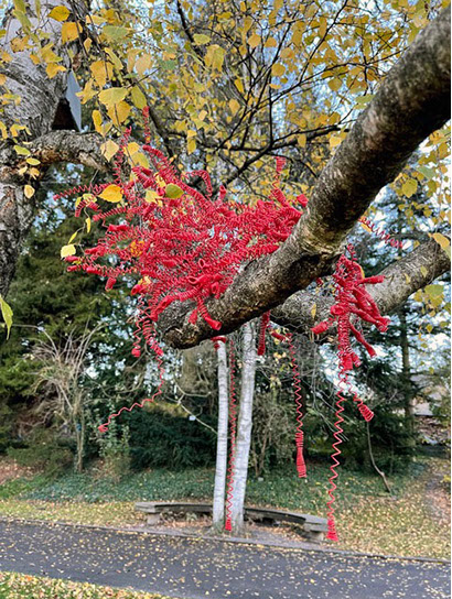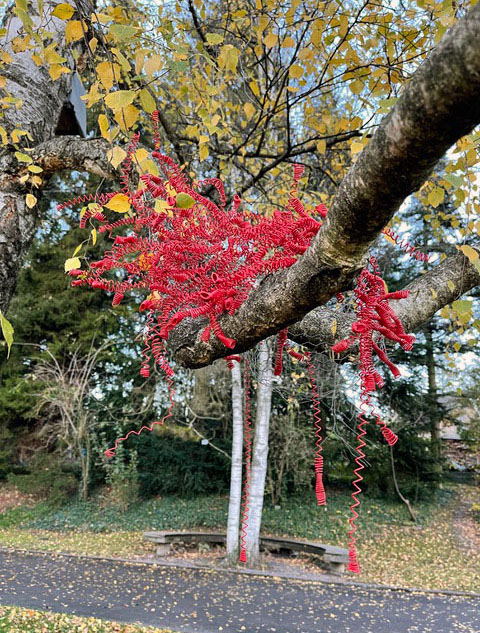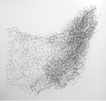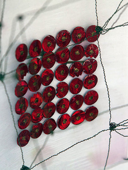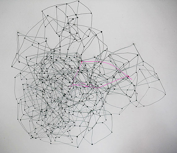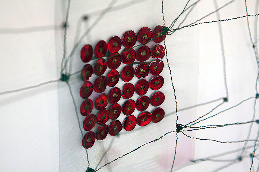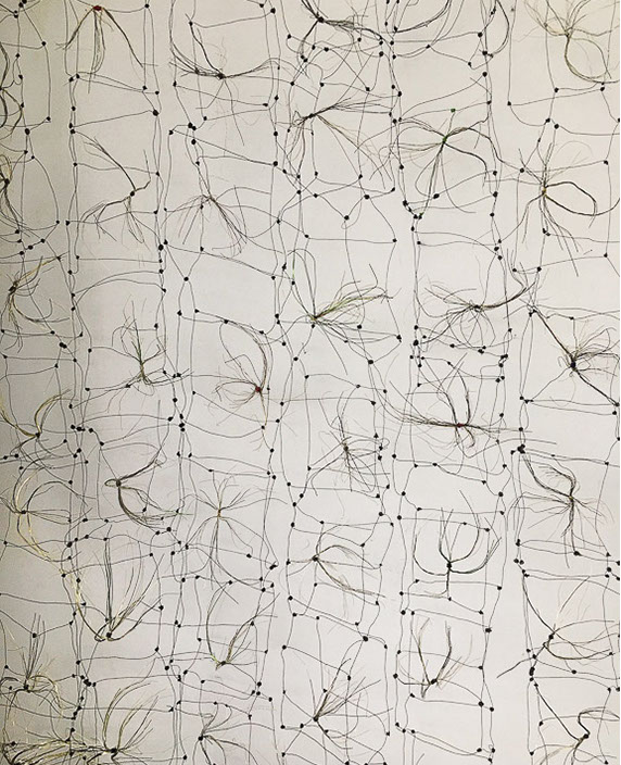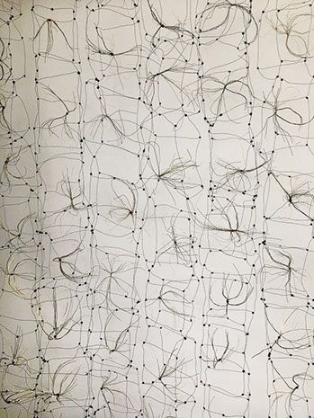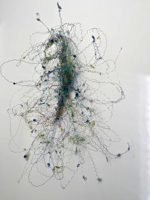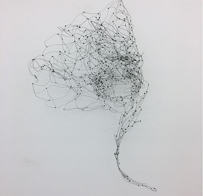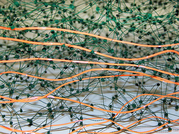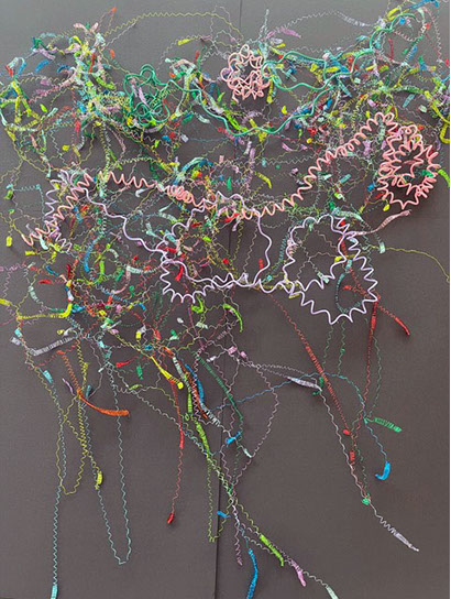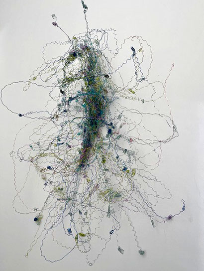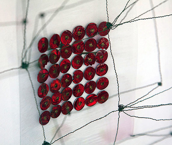 Beim ersten Blick auf die Drahtgeflechte von Rosmarie von Scarpatetti würden wir kaum erwarten, dass diese dichten, organisch anmutenden Netzstrukturen aus lauter einzelnen Drahtwürfeln bestehen. Wer dem Rhythmus der sich wiederholenden Linien und Punkte folgt, begibt sich in Landschaften und Räume, die undurchdringlich und zugleich durchlässig erscheinen. Verdichtung und Transparenz ziehen sich durch die Werke der Künstlerin aus dem Südtirol als roter – respektive drahtiger – Faden durch.