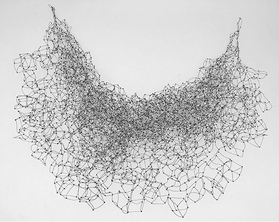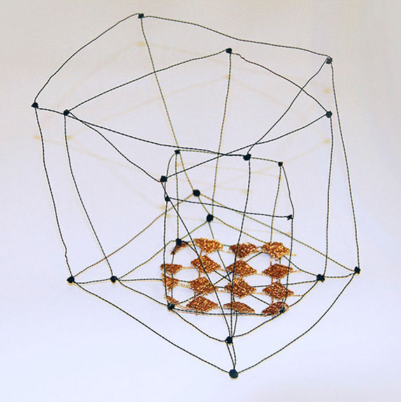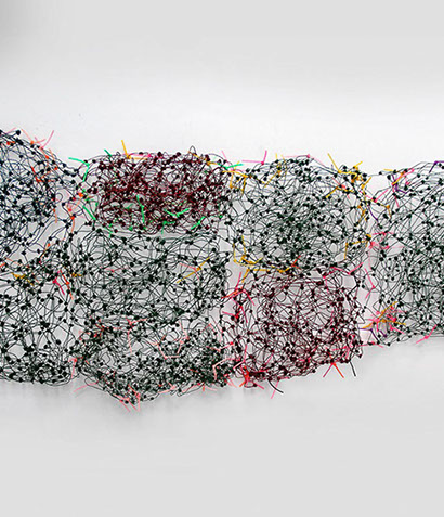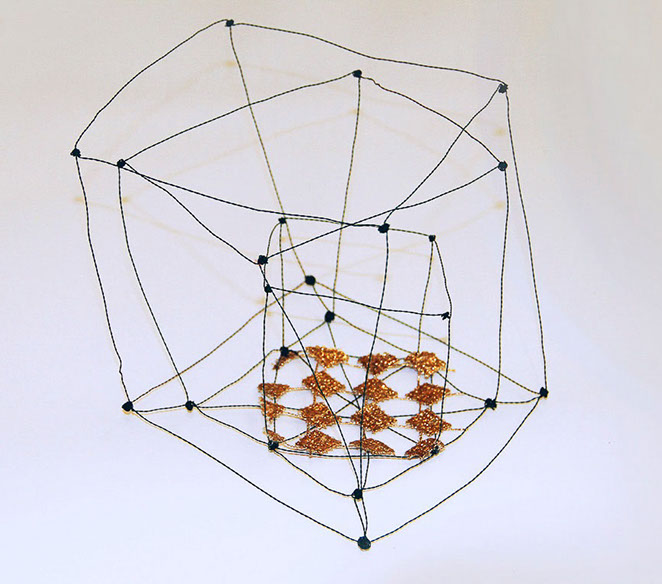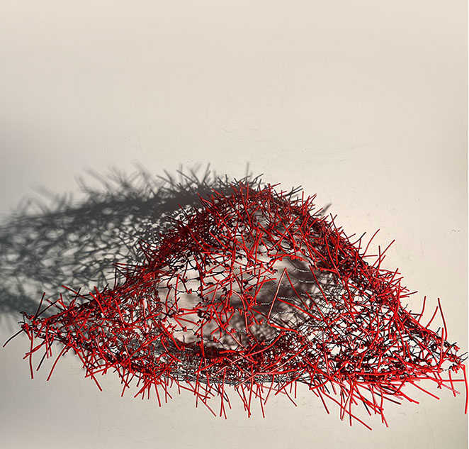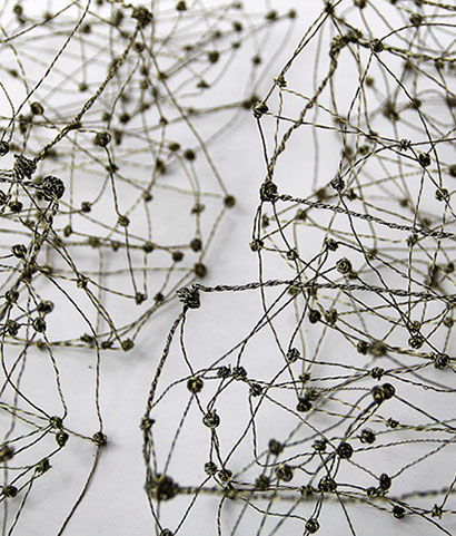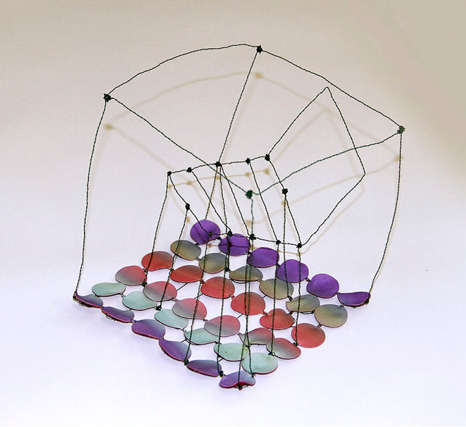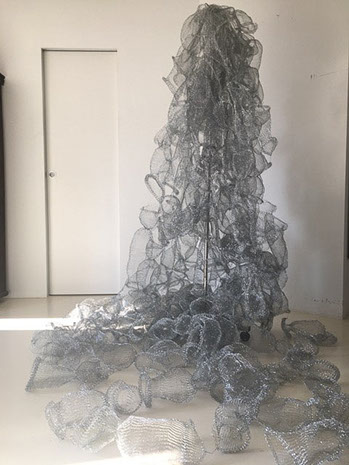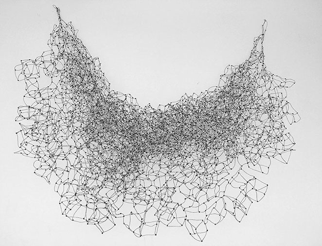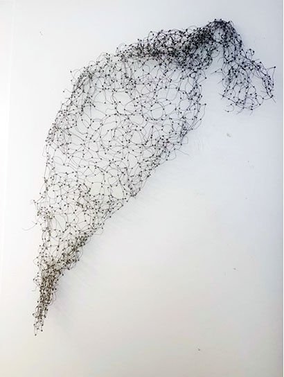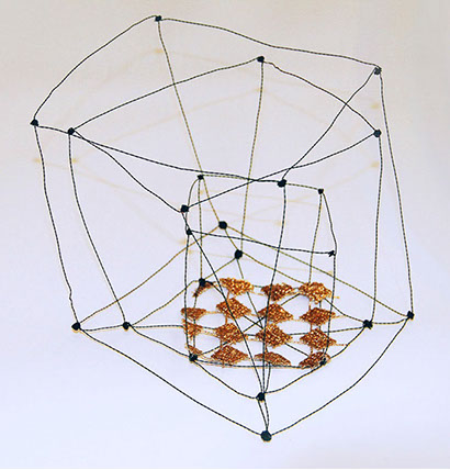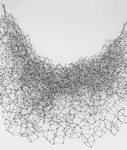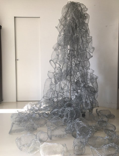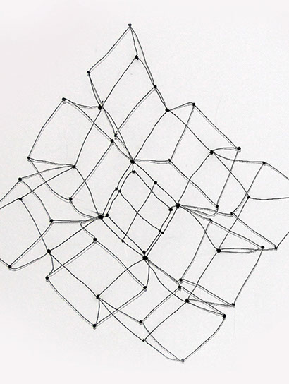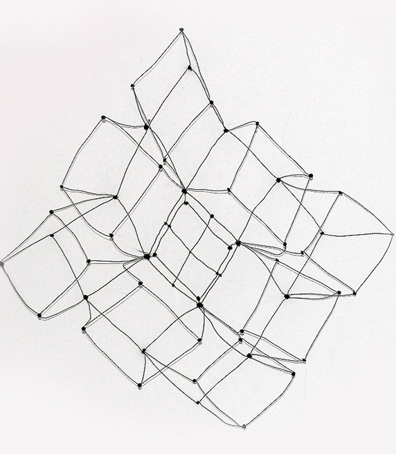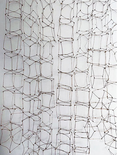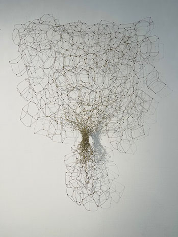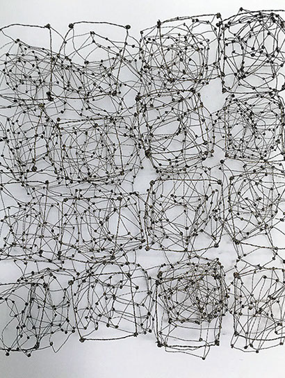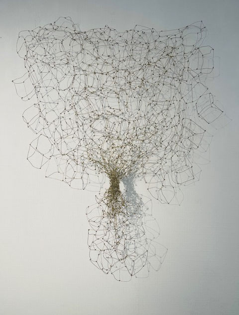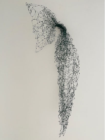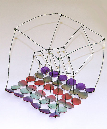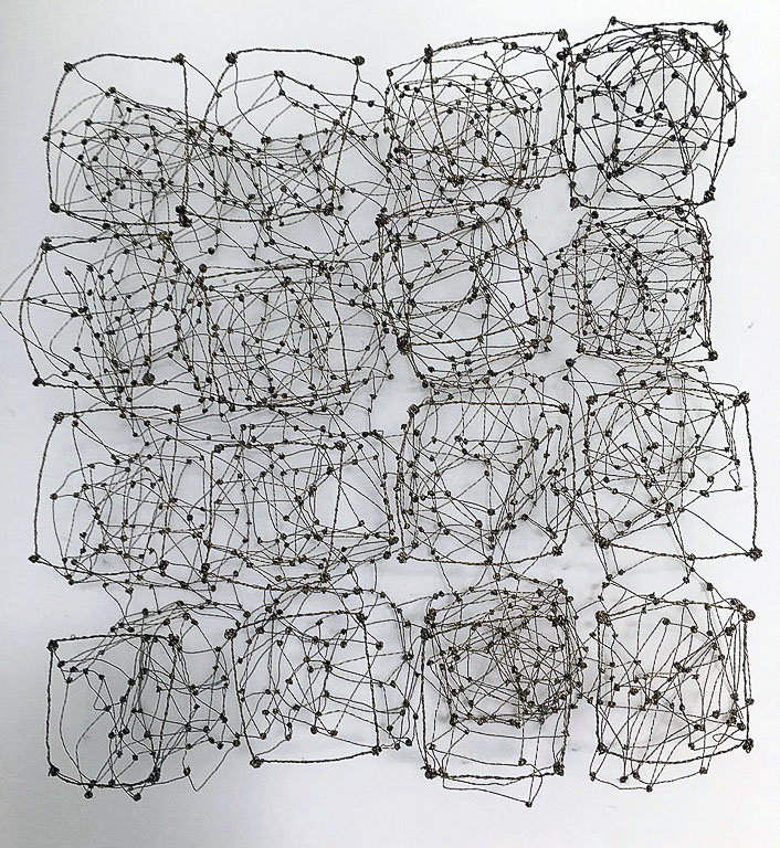 Aus feinstem Metalldraht formt sie luftige Würfel, aus deren vielfacher Verkettung federleichte Netzstrukturen entstehen, die wie organisch gewachsen anmuten.