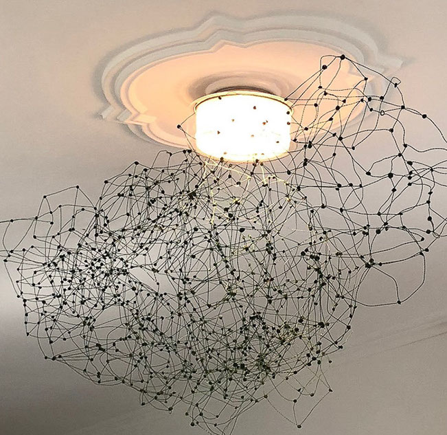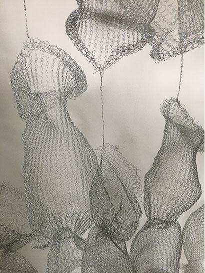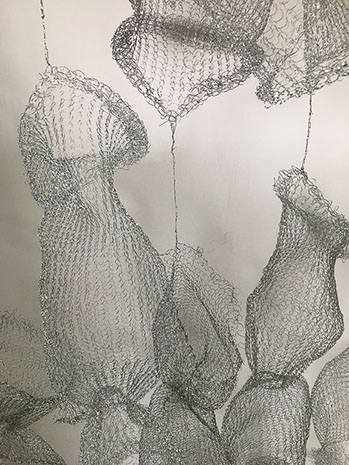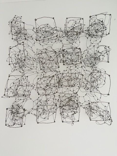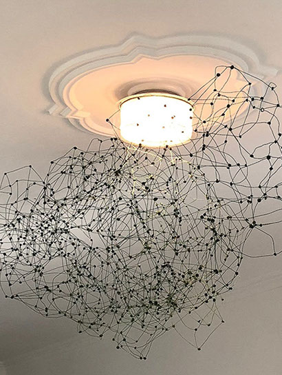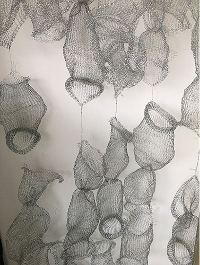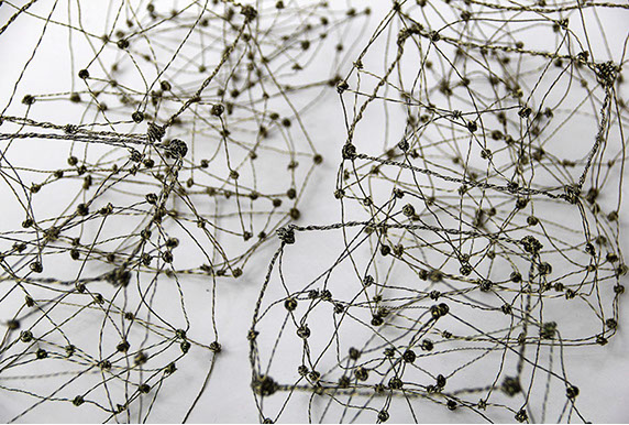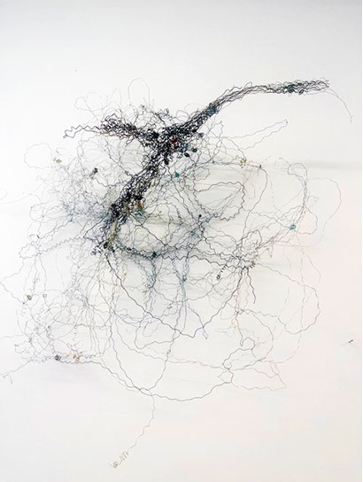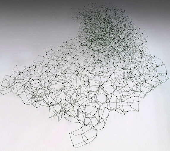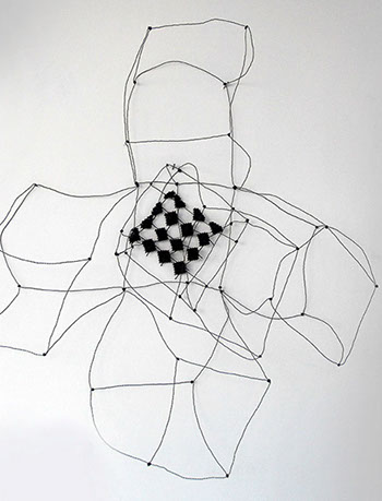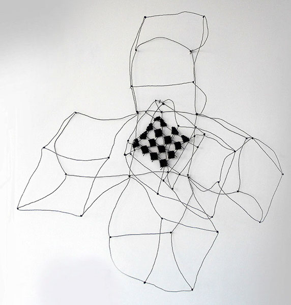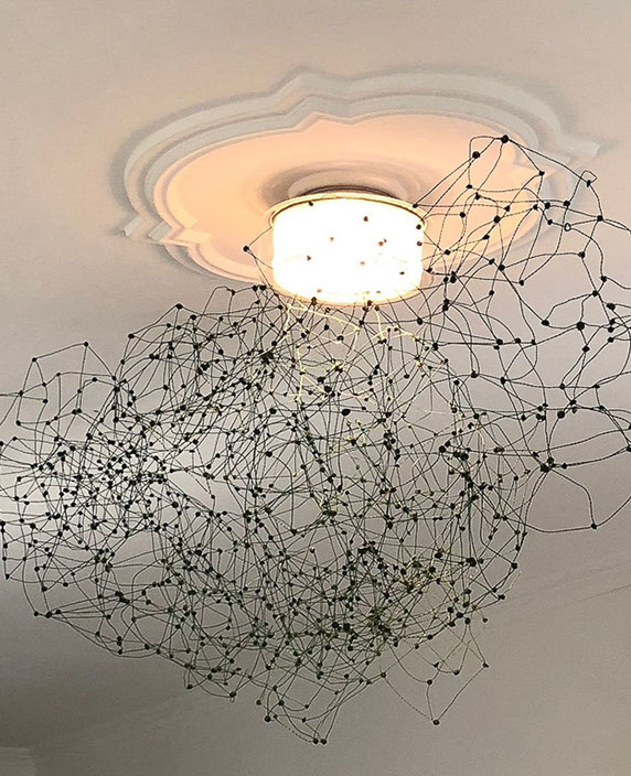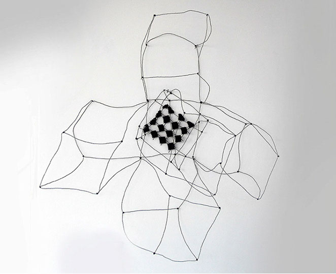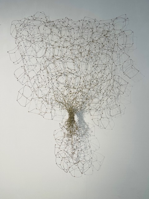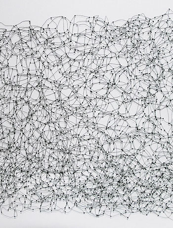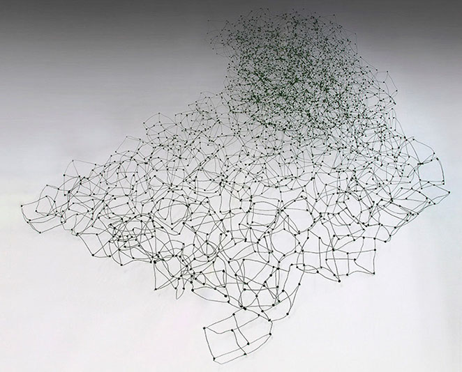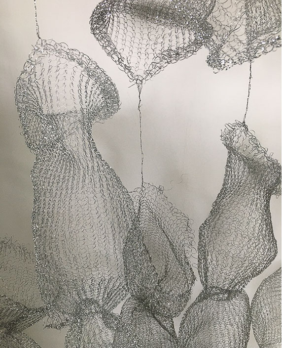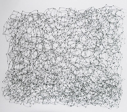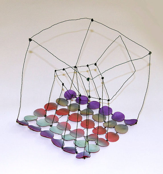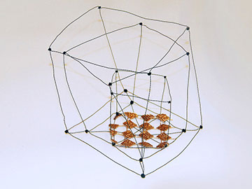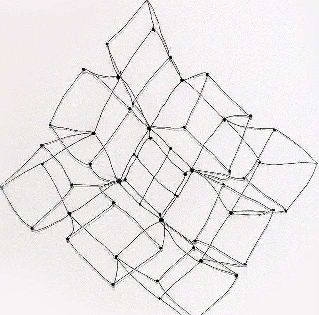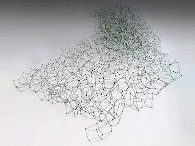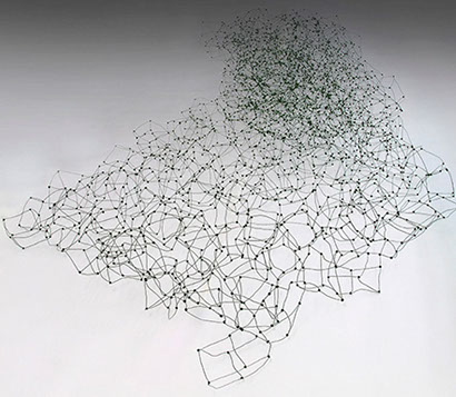 Aus feinstem Metalldraht formt sie luftige Würfel, aus deren vielfacher Verkettung federleichte Netzstrukturen entstehen, die wie organisch gewachsen anmuten.