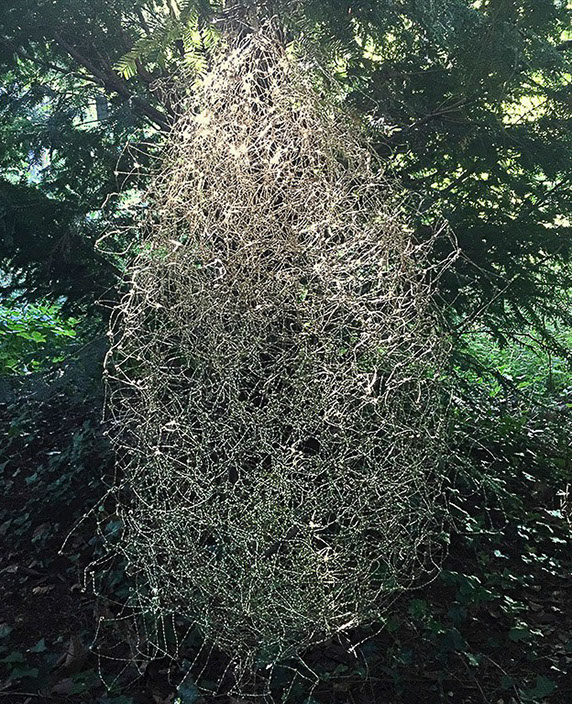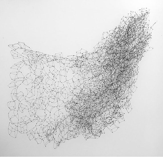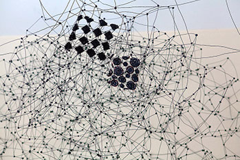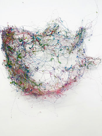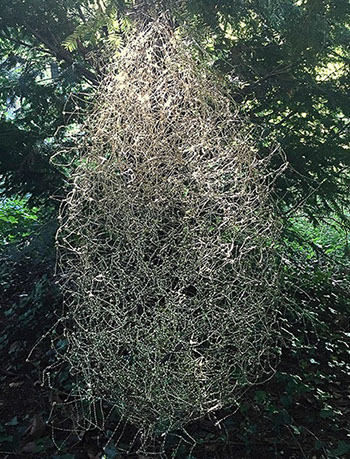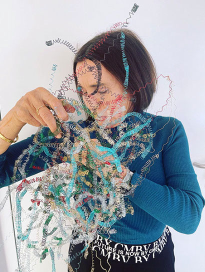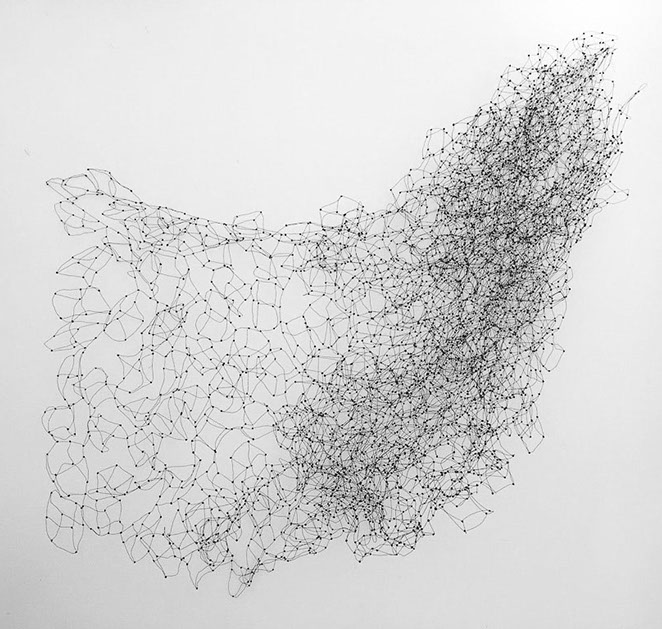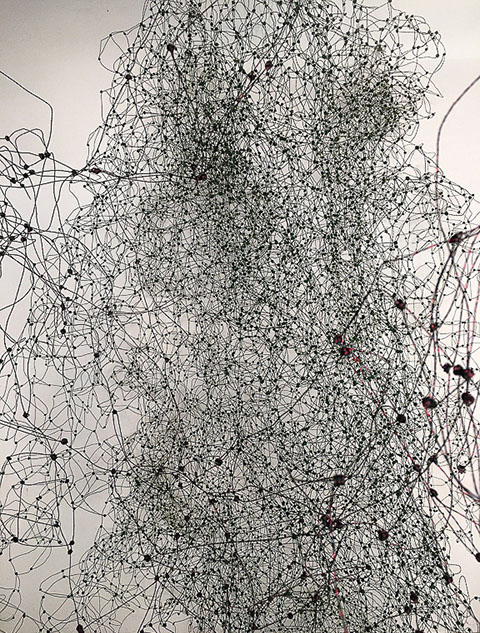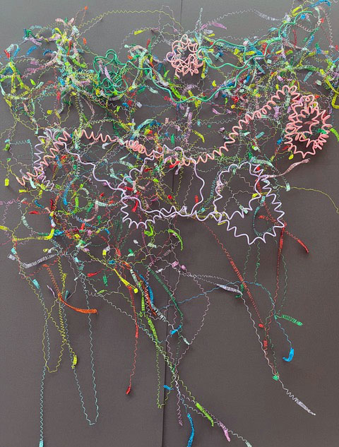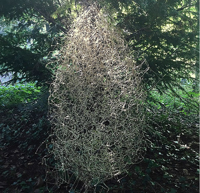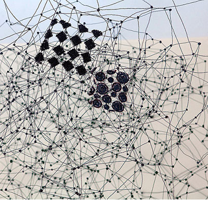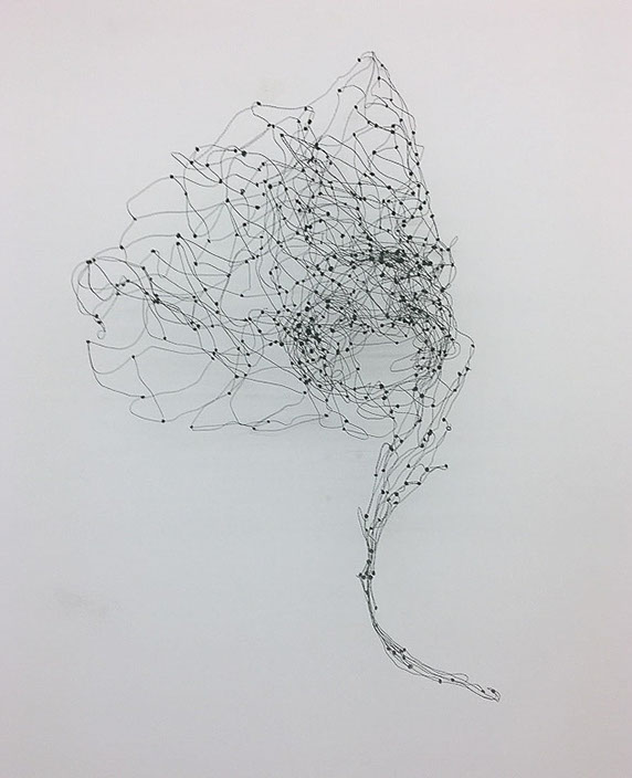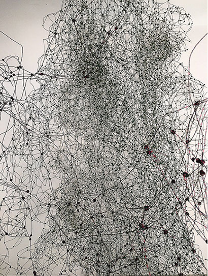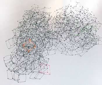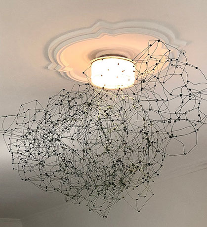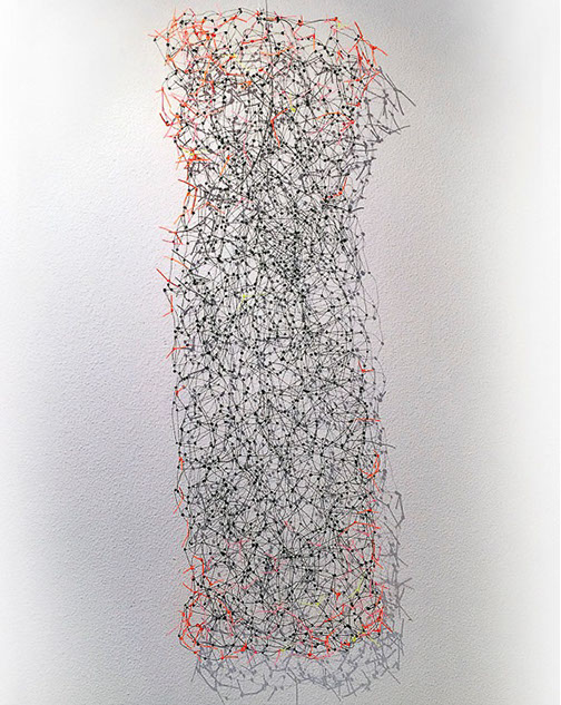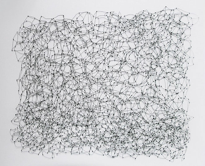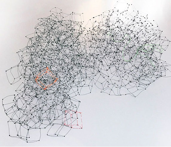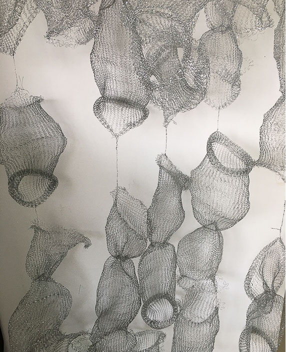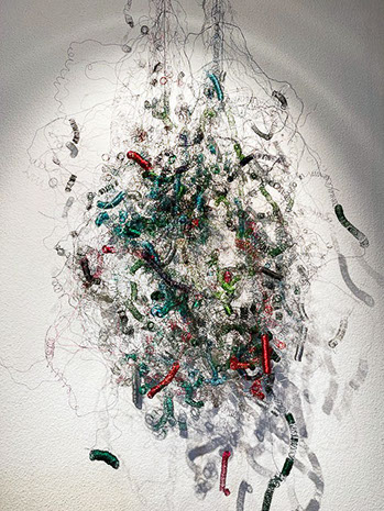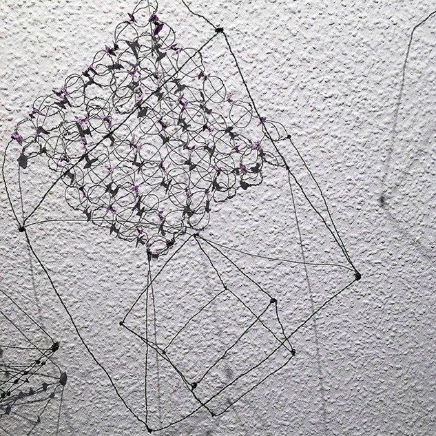 Aus feinstem Metalldraht formt sie luftige Würfel, aus deren vielfacher Verkettung federleichte Netzstrukturen entstehen, die wie organisch gewachsen anmuten.