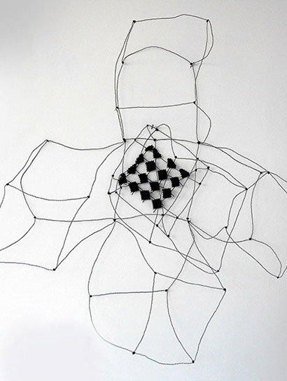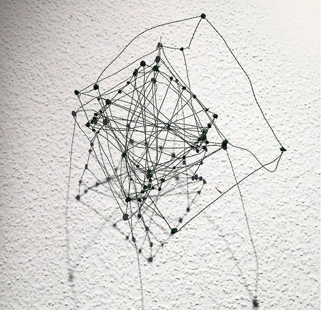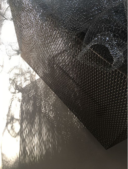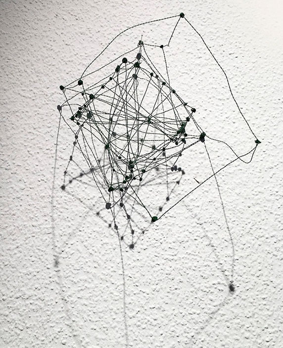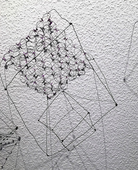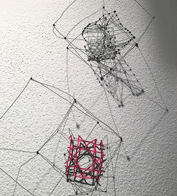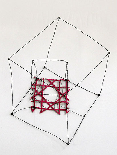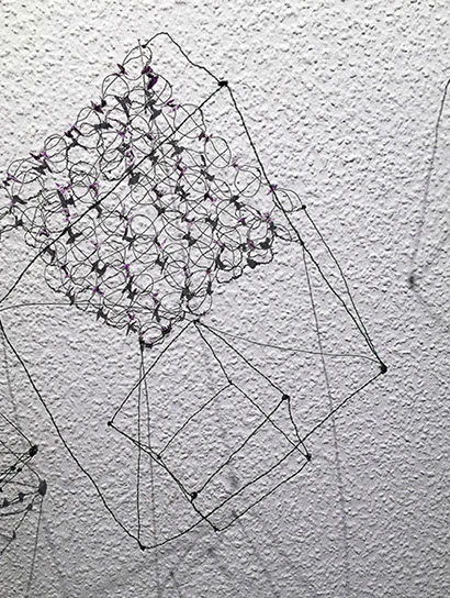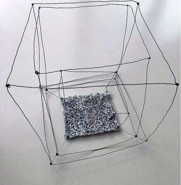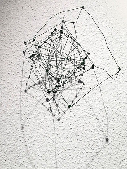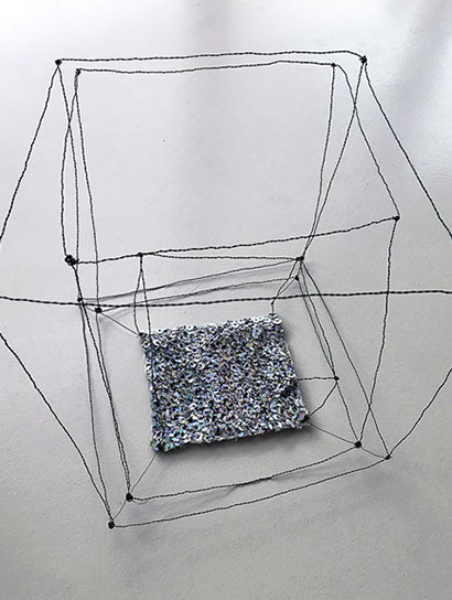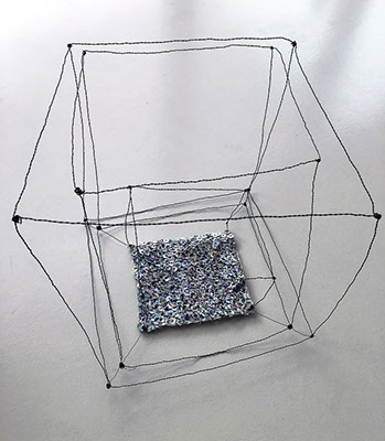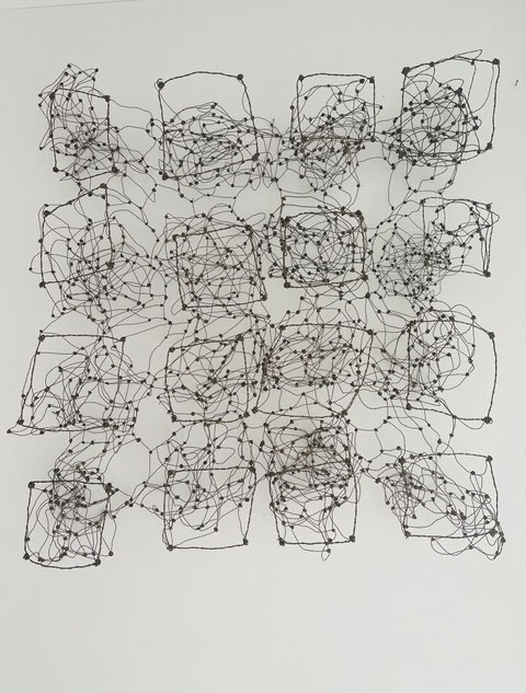 Ihr Material erschafft sich die Künstlerin selbst. Sie verdreht verschiedene feine Drähte zu einem etwas dickeren, farblich zuweilen changierenden Draht – eine erste Verdichtung –, aus dem sie dann ihre Würfel formt. Die einzelnen, ausgeklügelten Arbeitsschritte sind längst verinnerlicht. Beinahe meditativ biegt sie die mit einer Schere zugeschnittenen Drahtstücke aus Silber-, Messing- oder Metalldraht (0.35 mm) zurecht und verknotet diese mit neuen Drahtteilen, bis alle Seitenlinien des Würfels in einem leicht schepsen, rechten Winkel zu einander stehen. Auf ihrem Arbeitstisch reiht sich Würfel um Würfel zu einer in sich verknoteten, dreidimensionalen Fläche. Zuweilen schachtelt sie auch mehrere Würfel ineinander. Bei der finalen Formfindung hängt sie ihr Material an die Wand und ‘modelliert’ Linien und Punkte intuitiv zu neuen – teils transparenten, teils stark verdichteten – Räumen. Sie spürt der Form aus verschiedenen Distanzen nach und reagiert, bis es für sie stimmt: «Mit Begrenzung und Entgrenzung, auch mit Hell und Dunkel will ich einen spezifischen Ausdruck von Spannung erzeugen». Sowohl Werkprozess wie auch die gesamte Komposition sind bestimmt von seriellen Formationen. «Kleine Welten, die ein grosses Ganzes erschaffen.»