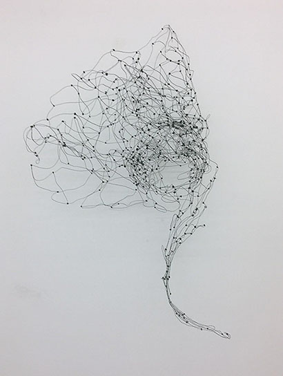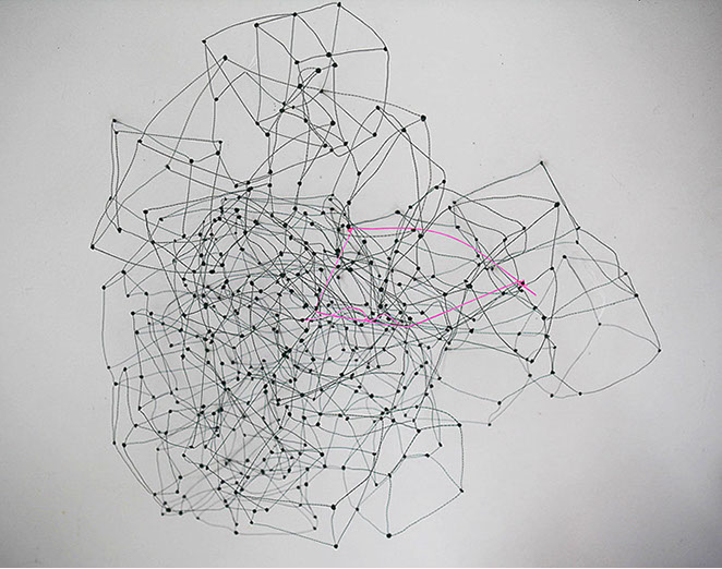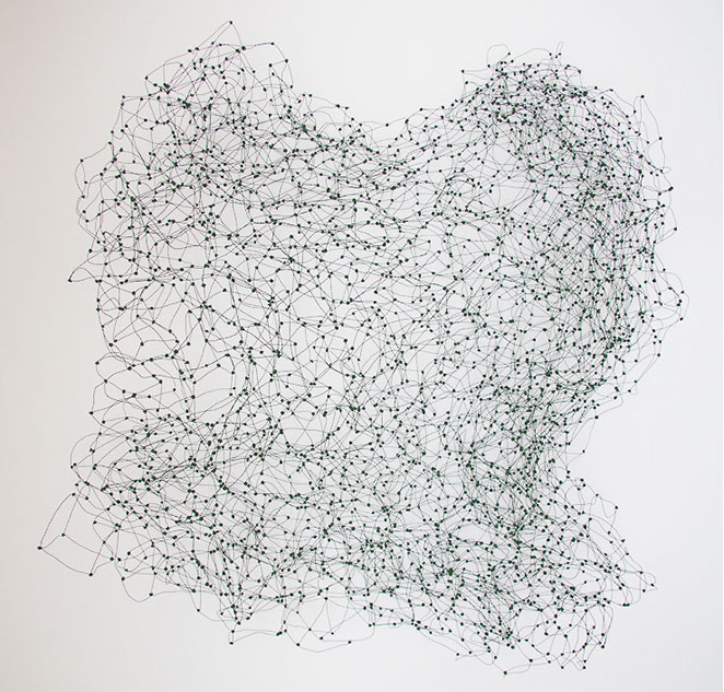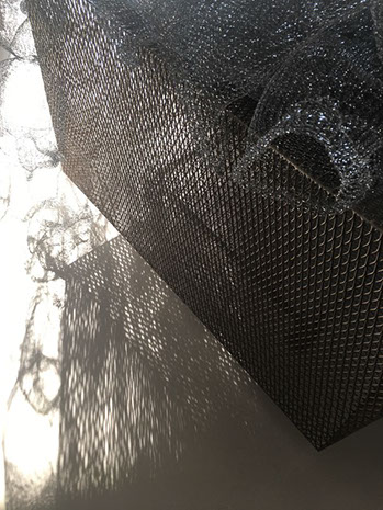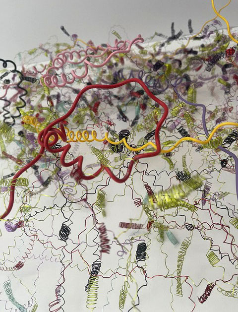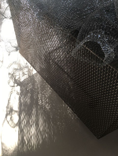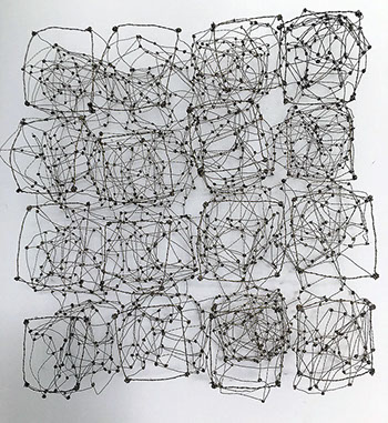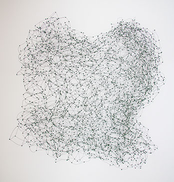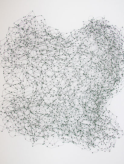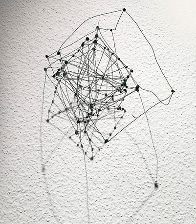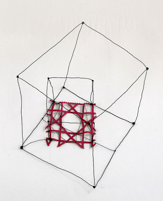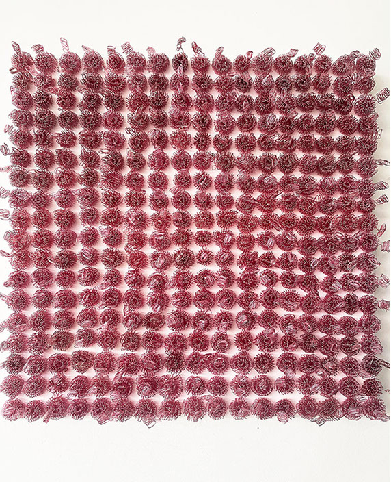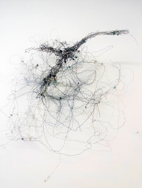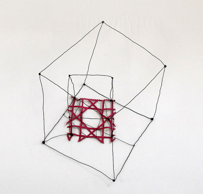 Ihr Material erschafft sich die Künstlerin selbst. Sie verdreht verschiedene feine Drähte zu einem etwas dickeren, farblich zuweilen changierenden Draht – eine erste Verdichtung –, aus dem sie dann ihre Würfel formt. Die einzelnen, ausgeklügelten Arbeitsschritte sind längst verinnerlicht. Beinahe meditativ biegt sie die mit einer Schere zugeschnittenen Drahtstücke aus Silber-, Messing- oder Metalldraht (0.35 mm) zurecht und verknotet diese mit neuen Drahtteilen, bis alle Seitenlinien des Würfels in einem leicht schepsen, rechten Winkel zu einander stehen. Auf ihrem Arbeitstisch reiht sich Würfel um Würfel zu einer in sich verknoteten, dreidimensionalen Fläche. Zuweilen schachtelt sie auch mehrere Würfel ineinander. Bei der finalen Formfindung hängt sie ihr Material an die Wand und ‘modelliert’ Linien und Punkte intuitiv zu neuen – teils transparenten, teils stark verdichteten – Räumen. Sie spürt der Form aus verschiedenen Distanzen nach und reagiert, bis es für sie stimmt: «Mit Begrenzung und Entgrenzung, auch mit Hell und Dunkel will ich einen spezifischen Ausdruck von Spannung erzeugen». Sowohl Werkprozess wie auch die gesamte Komposition sind bestimmt von seriellen Formationen. «Kleine Welten, die ein grosses Ganzes erschaffen.»