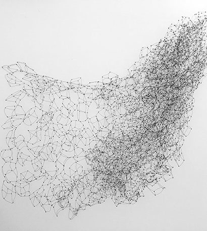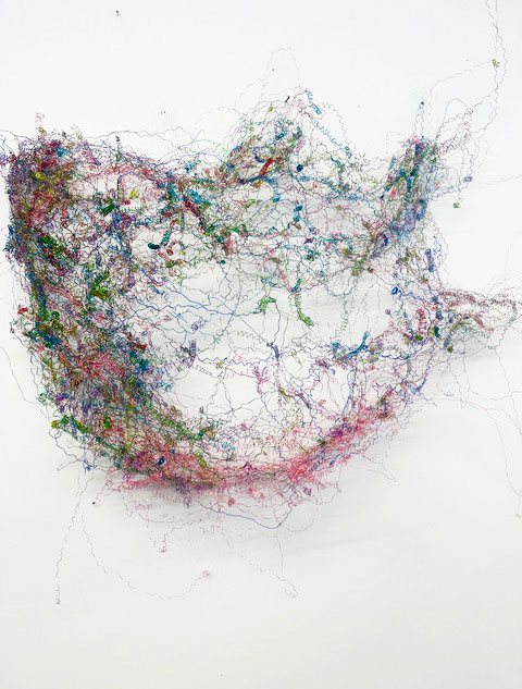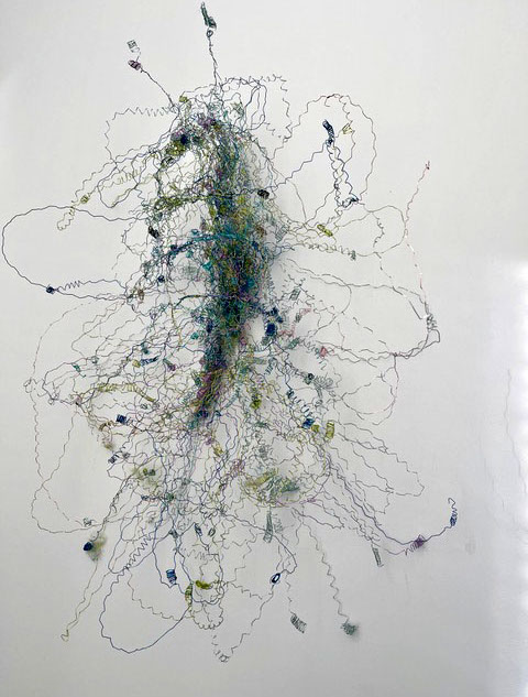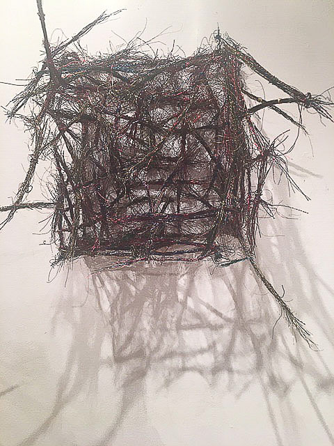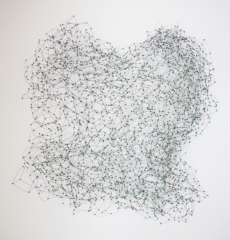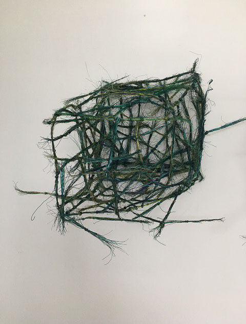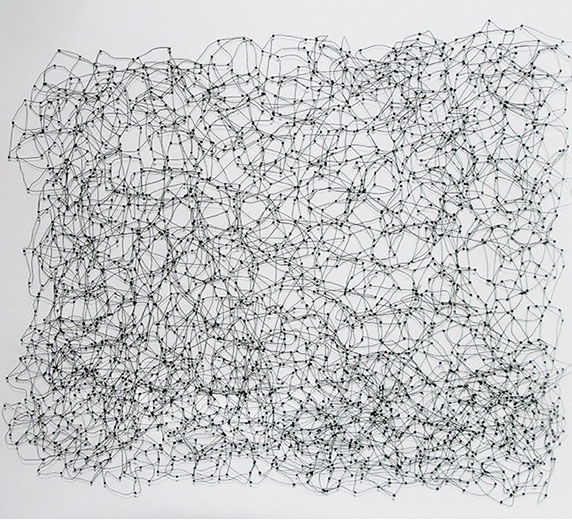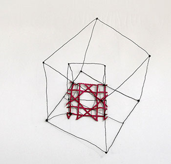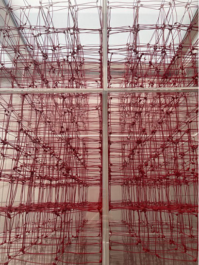 «Dicht assoziere ich mit Etwas, das eng zusammen ist, konzentriert, nicht viel Raum beansprucht. Für mich kommt aber schnell auch der Gedanke vom Verdichten.» Damit sind wir mitten im prägenden Thema der Werke von Rosmarie von Scarpatetti: es geht immer um das Ausdehnen und Verdichten, um Begrenzung und Entgrenzung. Mit Hilfe von Knotenpunkten sind Tausende von einzelnen Würfeln miteinander verflochten und lassen sich räumlich beliebig verdichten.